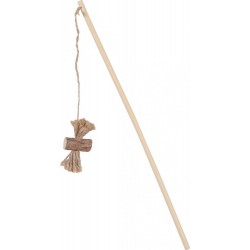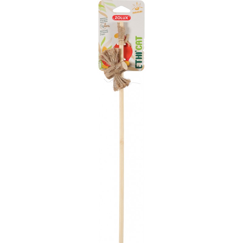 Jouet éco-conçus pour chats ETHI'CAT. Canne à pêche en bambou avec jouet suspendu en forme de noeud réalisé en bâton naturel de matatabi* (effet euphorisant sur le chat). Fabriqué à partir de 100% de matières d'origine naturelle: bâton de matatabi, lien et pompon en jute, canne en bambou. * Le matatabi est une matière naturelle renouvelable qui pousse à l’état sauvage dans les montagnes et qui a un effet euphorisant sur le chat. Sa récolte ne nécessite pas l’abattage d’arbres. Seules les branches sont utilisées pour la fabrication de nos jouets. Un jouet durable: si le bâton perd de son effet, il suffit de le frotter pour raviver son attractivité.