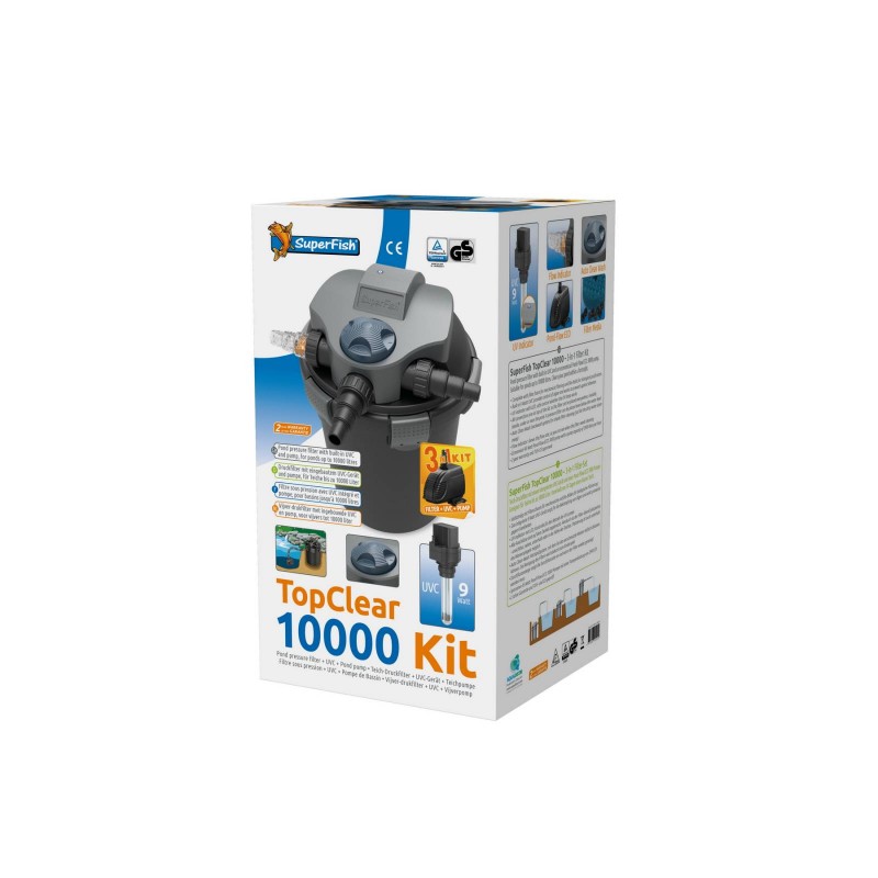 Les filtres TopClear 5000 et 10000 sont également disponibles en kit avec une pompe adaptée. Le kit TopClear 5000 est équipé de la pompe Pond-Flow ECO 2000 d'une capacité de 2.000 litres par heure de 25 watts. Le kit TopClear 10000 est équipé d'une pompe Pond-Flow ECO 3000 de 45 watts, d'une capacité de 2.900 litres par heure.