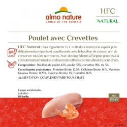 COMPOSITION: Bouillon de poulet 42%, poulet 37%, crevettes 18%, riz 3%.