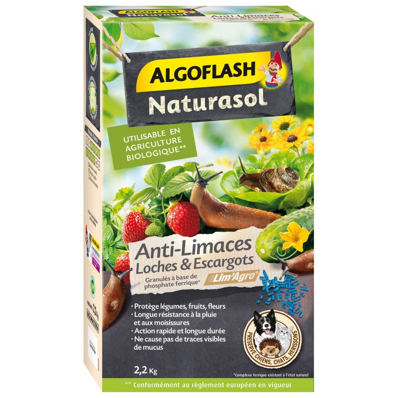 Appât granulé anti-limaces prêt à l’emploi. A base de phosphate de fer, un complexe ferrique minéral naturel qui est transformé en éléments nutritifs par les micro-organismes du sol. Il permet de lutter efficacement contre toutes les espèces de limaces, loches et escargots qui envahissent vos potagers, semis, pelouses et massifs ornementaux. Longue résistance à la pluie et aux moisissures. Préserve les animaux domestiques et les hérissons. Utilisable en Agriculture Biologique*.MENTIONS OBLIGATOIRES: