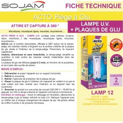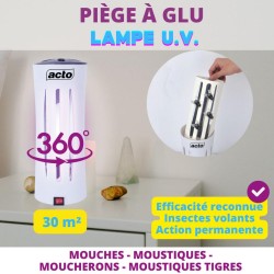 • ACTO PIÈGE À GLU - LAMPE U.V. protège votre intérieur (cuisine, salon, chambres…) des moustiques, moustiques tigres, mouches, moucherons… Attirés par la lumière ultraviolette, diffusée à 360° autour de la lampepiège, les insectes volants s’engluent sur la surface collante de la plaque de glu située à l’intérieur de la lampe-piège. Prisonniers, ils meurent rapidement. Inodore, silencieuse et sans insecticide, la lampe-piège simplifie au quotidien la lutte contre les insectes volants indésirables dans les habitations. La plaque de glu est efficace jusqu’à 2 mois, en fonction de la poussière, et est à jeter dès qu’elle est pleine.