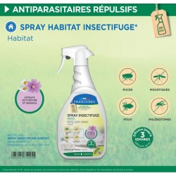 CONSEILS D'UTILISATION: Vaporiser le produit sur les endroits susceptibles d'être infestés par les parasites et où votre animal aime se coucher (panière, niches…). Le SPRAY INSECTIFUGE HABITAT dure jusqu'à 3 semaines. En cas de forte infestation, renouveler l'opération une fois par semaine jusqu'à disparition des parasites.