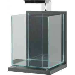 Kit Aquarium Jalaya avec support bois, éclairage LED et filtre. Cuve en verre. 4 plots de siliconne fournis à fixer en dessous de l'aquarium. Luminaire LED 3,6W, 15000K, 230Lm avec interrupteur tactile 3 positions: jour/bleu/off. Filtre intérieur cascade 30 180L/H (3W) avec cartouche Zéocarb (zéolite + charbon) et mousse bleue. Volume 10L.