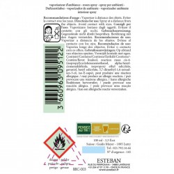 82% du total des ingrédients de ce vaporisateur sont issus de l'agriculture biologique. Ce vaporisateur est vegan et fabriqué en France dans les ateliers de la marque Estéban. Il contient des extraits naturels et de l'alcool végétal biologique, issu de culture de blé européen.