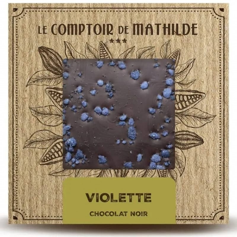Chocolat noir 98,1% (pâte de cacao, sucre, beurre de cacao, émulsifiant : lécithine de SOJA, arôme naturel de vanille. Cacao : 70% minimum), violette cristallisée 1,9% (sucre 96%, fleurs naturelles 2%, agent épaississant : gomme arabique, arôme, colorant : E120, E124*, E132).
