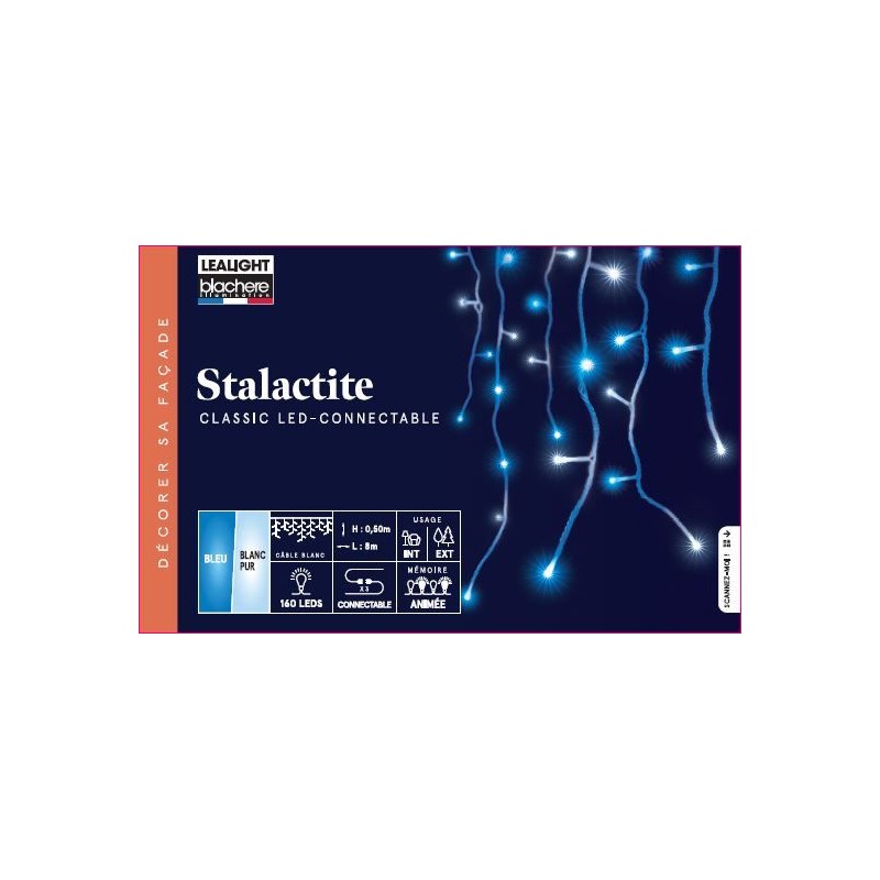 Stalactite Led Connectable Blanc Pur/Bleu Câble Blanc 24W Clignotant/Pour Intérieur Et Extérieur 0.5X8M-160L-BLACHERE