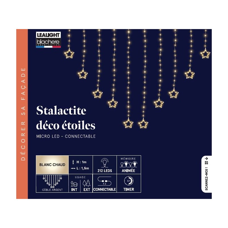 Cette guirlande stalactites étoiles de 0,15 m x 0,1 m est équipée de 212 micro LED blanc chaud. Elle offre 8 animations lumineuses et peut être connectée jusqu’à 3 guirlandes.