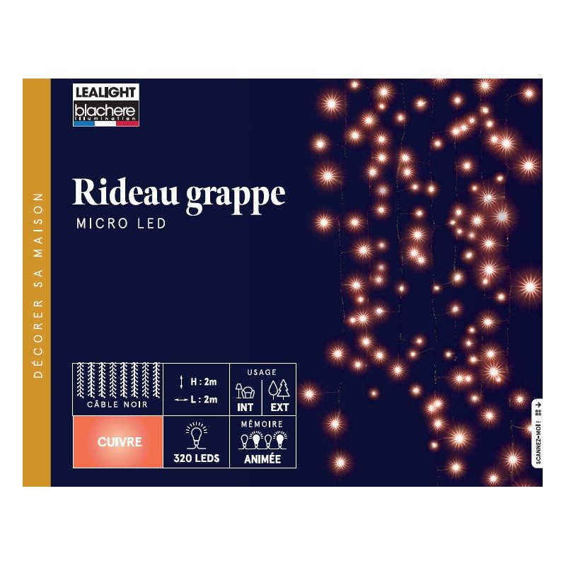 Créez une ambiance festive unique avec ce rideau micro LED grappe de couleur cuivre, mesurant 2m x 2m. Composé de 320 LED fixes, il propose 8 descentes animées avec un effet cascade élégant. Adapté pour usage intérieur et extérieur grâce à sa protection IP44, il fonctionne en toute sécurité sur secteur 12V DC.