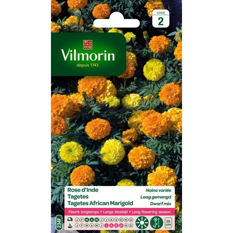 Variété naine donnant de belles fleurs rondes, type chrysanthème, aux coloris variant du jaune citron à l'orange. Par leurs couleurs éclatantes et leur floraison longue et abondante, ces roses d'Inde très robustes sont idéales pour embellir vos massifs bas et bordures.