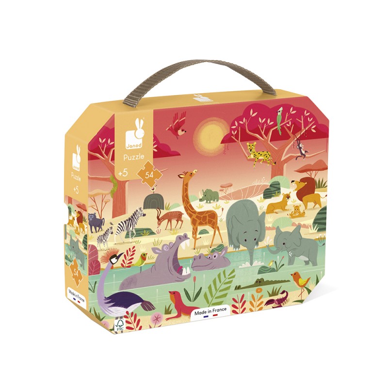 Explore cette réserve animalière en Afrique, tout en développant ta mémoire et dextérité, avec ce beau puzzle en carton de 54 pièces. Dans sa jolie valisette, ce puzzle sera facile à transporter grâce à sa poignée en tissu. Contient un poster servant de modèle pour les débutants, les plus aguerris pourront ensuite réaliser le puzzle en toute autonomie. Fabriqué en France, produit FSC et à base d'encres végétales.