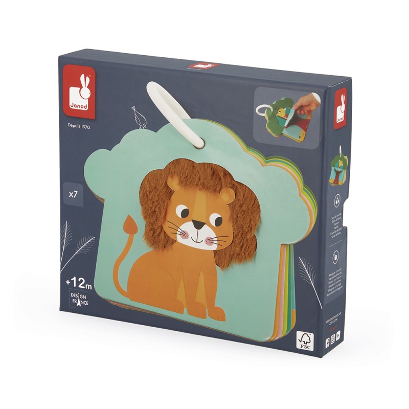 Partez à la découverte des animaux de la savane ! En soulevant le feuillage du baobab, votre enfant découvrira l'une des 6 cartes texturées sur le thème des animaux de la savane. Qui est le plus doux ? Le croco ou la girafe ? Ce jouet d'éveil est idéal pour développer le sens du toucher. Il est aussi très pratique à transporter partout grâce à son anneau en plastique. Jouet en carton FSCTM. Jouet d'éveil pour les enfants à partir de 12 mois.