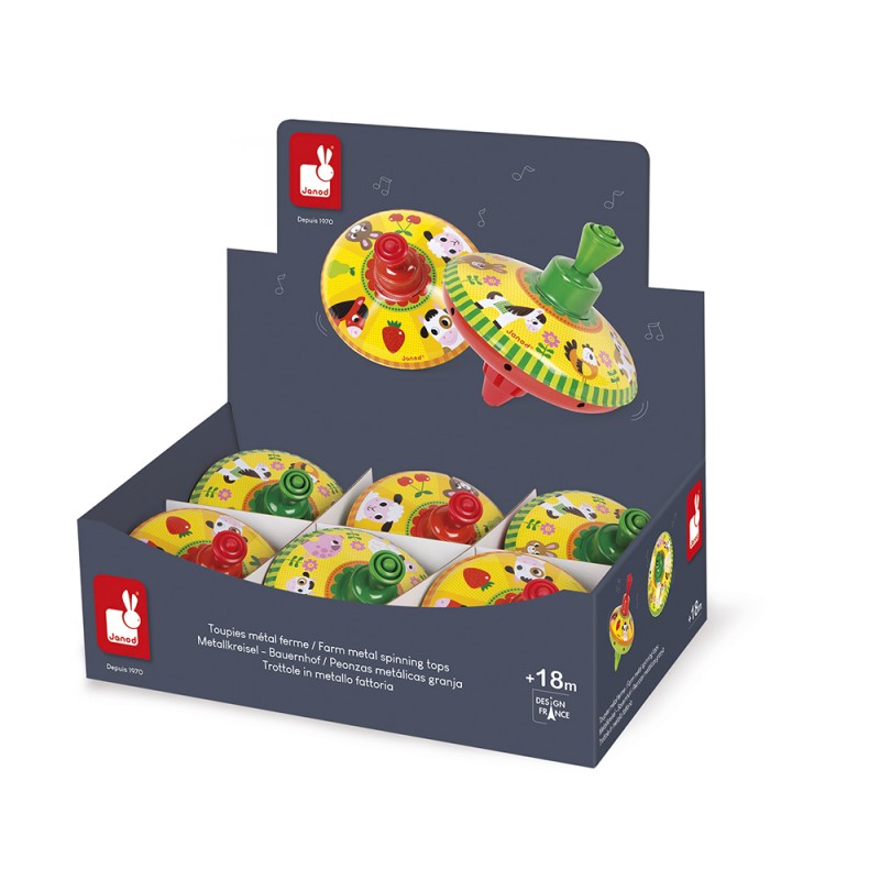 Cette toupie très colorée développera la dextérité des tout-petits. En faisant tourner la toupie, un léger bourdonnement retentit. Il suffit de pousser le levier vers le bas pour que les animaux tournent à toute vitesse et que la toupie reste en équilibre. Toupie en métal sur le thème des animaux de la ferme. 2 modèles assortis. Poignée en plastique. Livrées par display de 6 pièces.