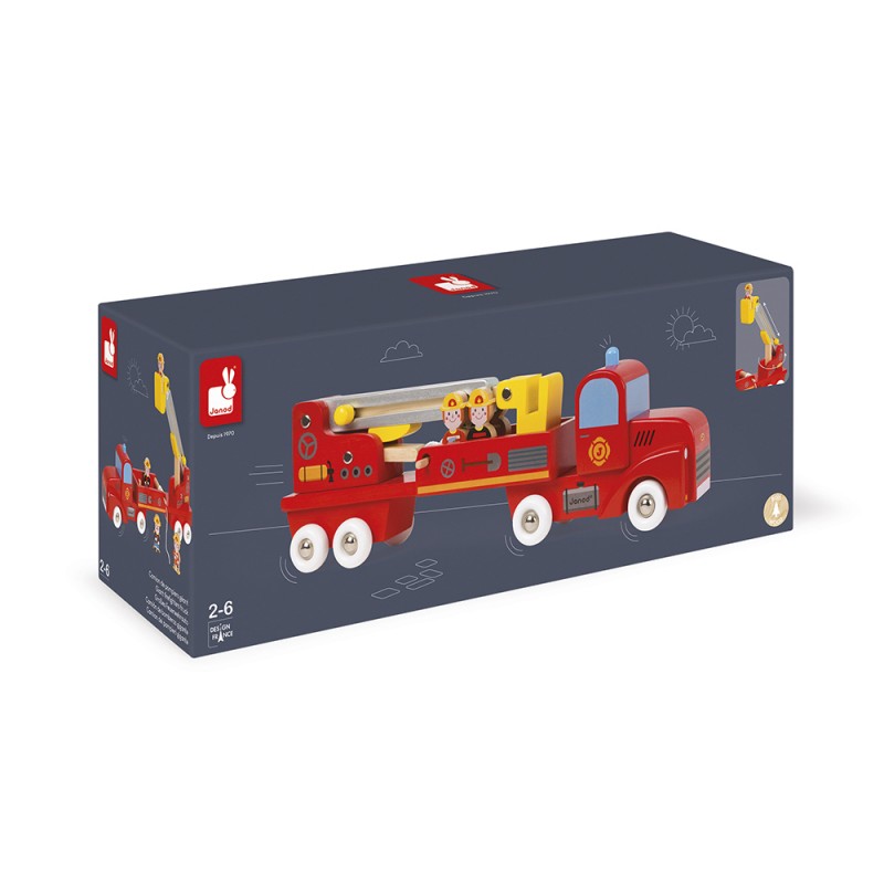 Véritable camion de pompiers équipé d'une lance à incendie et d'une échelle télescopique et rotative. Livré avec 4 pompiers de la gamme Story. Bois : pin. Impression par transfert à chaud sur le camion et les pompiers. Pack: boite couleur fermée