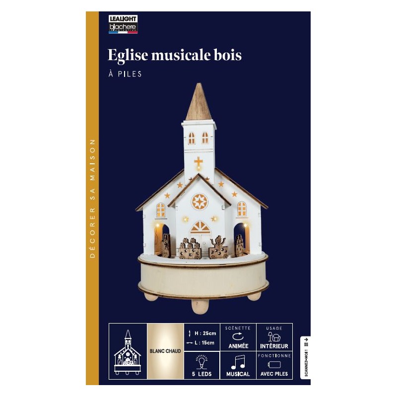 Cette église en bois illuminée par LED blanc chaud diffuse une ambiance chaleureuse. Animée avec musique, elle est parfaite pour votre décoration intérieure de Noël.