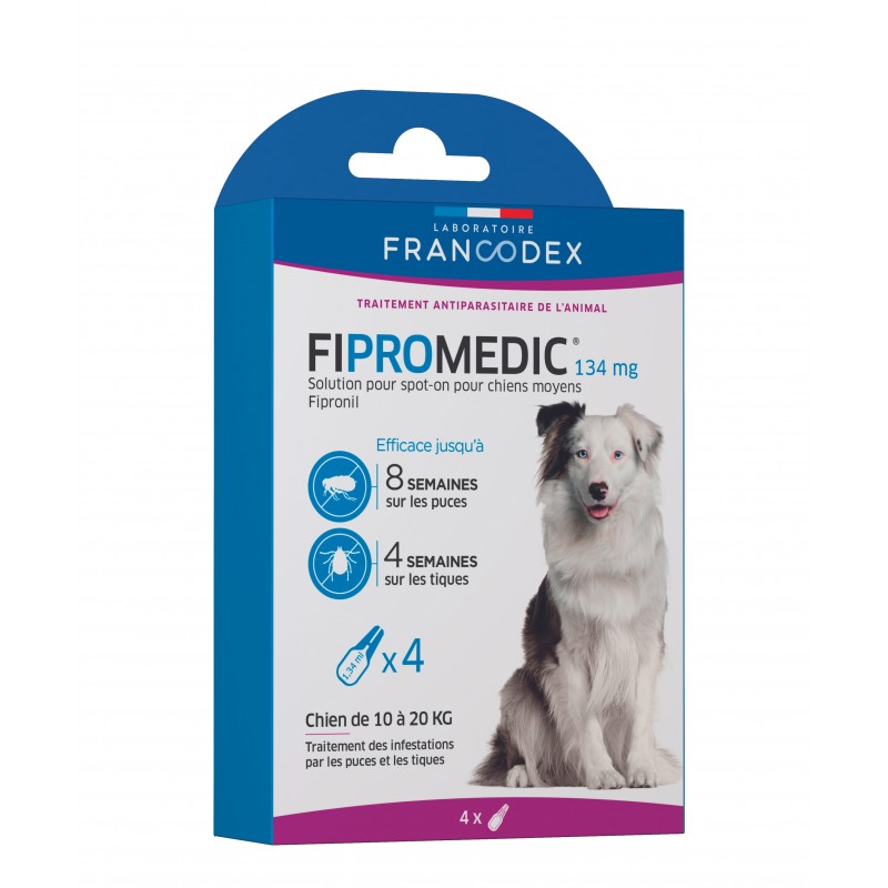 CONSEILS D'UTILISATION: Voie d'administration et dosage: Usage externe uniquement. Appliquer le produit directement sur la peau en fonction du poids de l'animal, comme suit: 1 pipette de 1,34 mL pour un chien pesant entre 10 kg et 20 kg. Mode d'administration: 1.Détacher une pipette et la tenir en position verticale. Donner de petits coups sur la partie étroite de la pipette pour s'assurer que le contenu est bien descendu dans la partie centrale de la pipette. 2.Rompre l'extrémité autocassable de la pipette pour spot-on en suivant la ligne gravée. 3.Ecarter les poils de l'animal jusqu'à ce que la peau soit visible. 4.Placer l'embout de la pipette directement sur la peau. 5.Presser doucement plusieurs fois pour vider entièrement le contenu de la pipette en un ou deux points le long du dos.