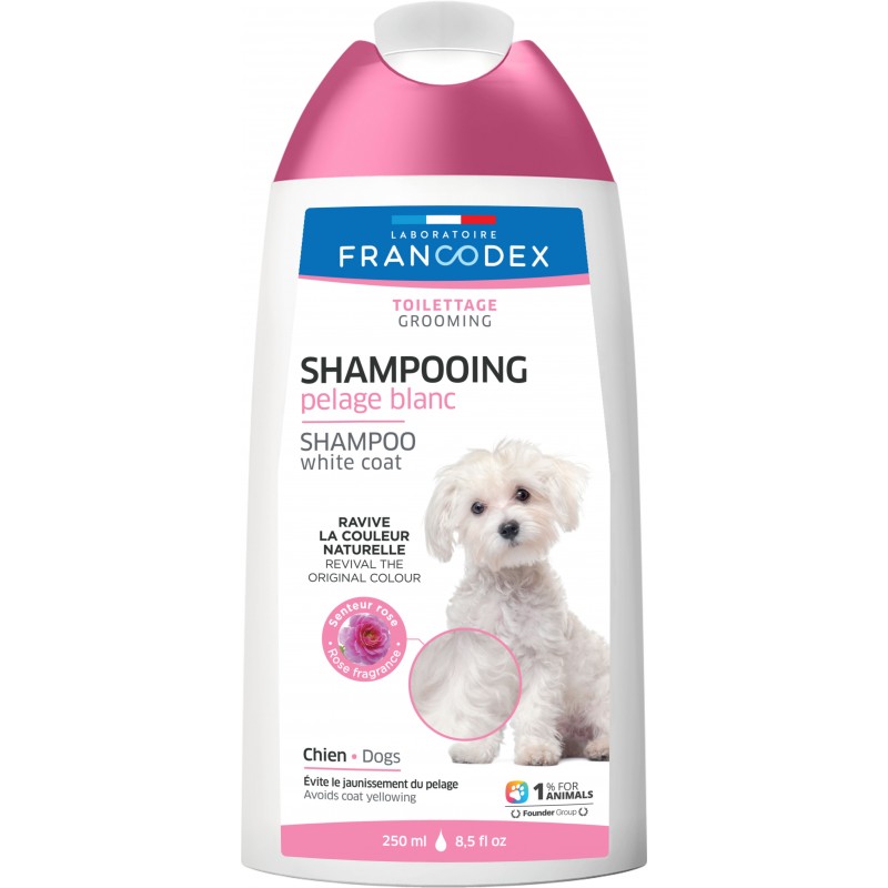 Le SHAMPOOING PELAGE BLANC FRANCODEX ravive la couleur blanche naturelle du poil grâce à la vitamine B3 aux propriétés éclaircissantes. Grâce à la coloration bleue du shampooing, le jaunissement du pelage est atténué. Son agent conditionneur rend le poil brillant et soyeux. Au pH neutre, il permet de nettoyer en douceur et de respecter l'hydratation naturelle de la peau, même en cas d'usage fréquent.
