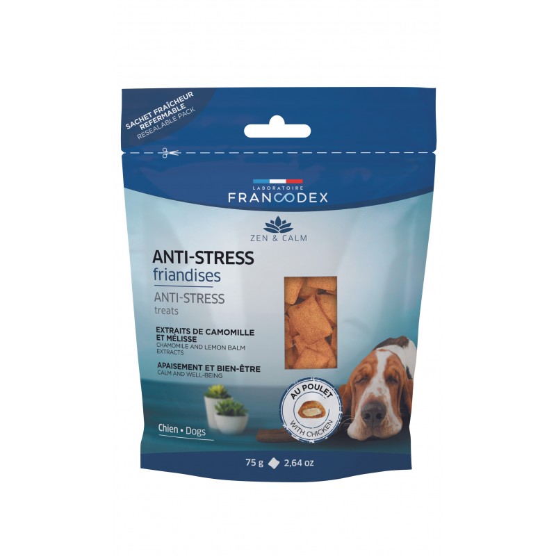 Les FRIANDISES ANTI-STRESS FRANCODEX contiennent du L-Tryptophane. Cet acide aminé est utilisé par l'organisme pour fabriquer la sérotonine, un neurotransmetteur qui va aider à apaiser les chiens hyperactifs, nerveux ou anxieux, sans effets secondaires ni dépendance. De plus, elles contiennent des extraits de mélisse et de camomille, connues pour leurs vertus apaisantes. Ces friandises sont particulièrement indiquées chez le chiot, en association avec une éducation positive, afin de réduire le stress des premiers temps de vie dans une nouvelle maison.