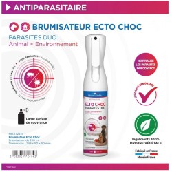 CONSEILS D'UTILISATION: Débloquer la sécurité et brumiser directement sur les parasites. ECTO CHOC PARASITE DUO agit par contact direct sur les parasites rampants et volants. La brumisation permet de couvrir une grande superficie dans l'environnement. Sur l'animal, brumiser à 30 cm de la peau, aux endroits où se trouvent les parasites, en évitant le contour des yeux et les muqueuses. En cas d'infestation massive sur l'animal, mouiller tout le corps (1 à 4 pulvérisations par kg), à adapter selon la nature et la longueur du pelage. Empêcher l'animal de se lécher quelques minutes en attendant le séchage du pelage puis essuyer ou brosser l'animal pour enlever les parasites. Attendre une semaine avant de renouveler l'application si des parasites sont toujours présents.