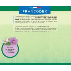 Formulé à base d'extraits de margosa, de géraniol et pyrèthre aux propriétés répulsives, le SHAMPOOING INSECTIFUGE FRANCODEX protège votre animal de toute infestation par des parasites.