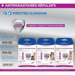 FRANCODEX, repousse les puces, tiques, mouches pendant 1 mois et les phlébotomes pendant 2 semaines. L'association des