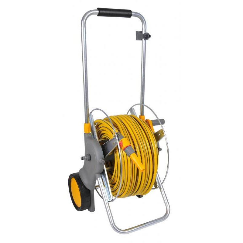 Grand dévidoir chariot équipé 30 m (ø 19) - Dévidoir sur roues - Tuyau ø 19 mm de 30 m inclus- - Livré assemblé - Comprend : 1 lance. 2 raccord Plus fin de tuyau. 1 raccord Plus stop. 1 raccord pour robinet fileté ø 26/34 avec adaptateurs 20/27 et 15/21 -